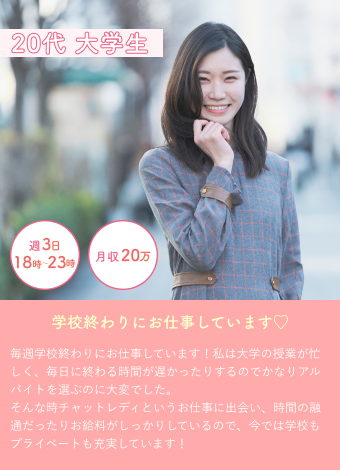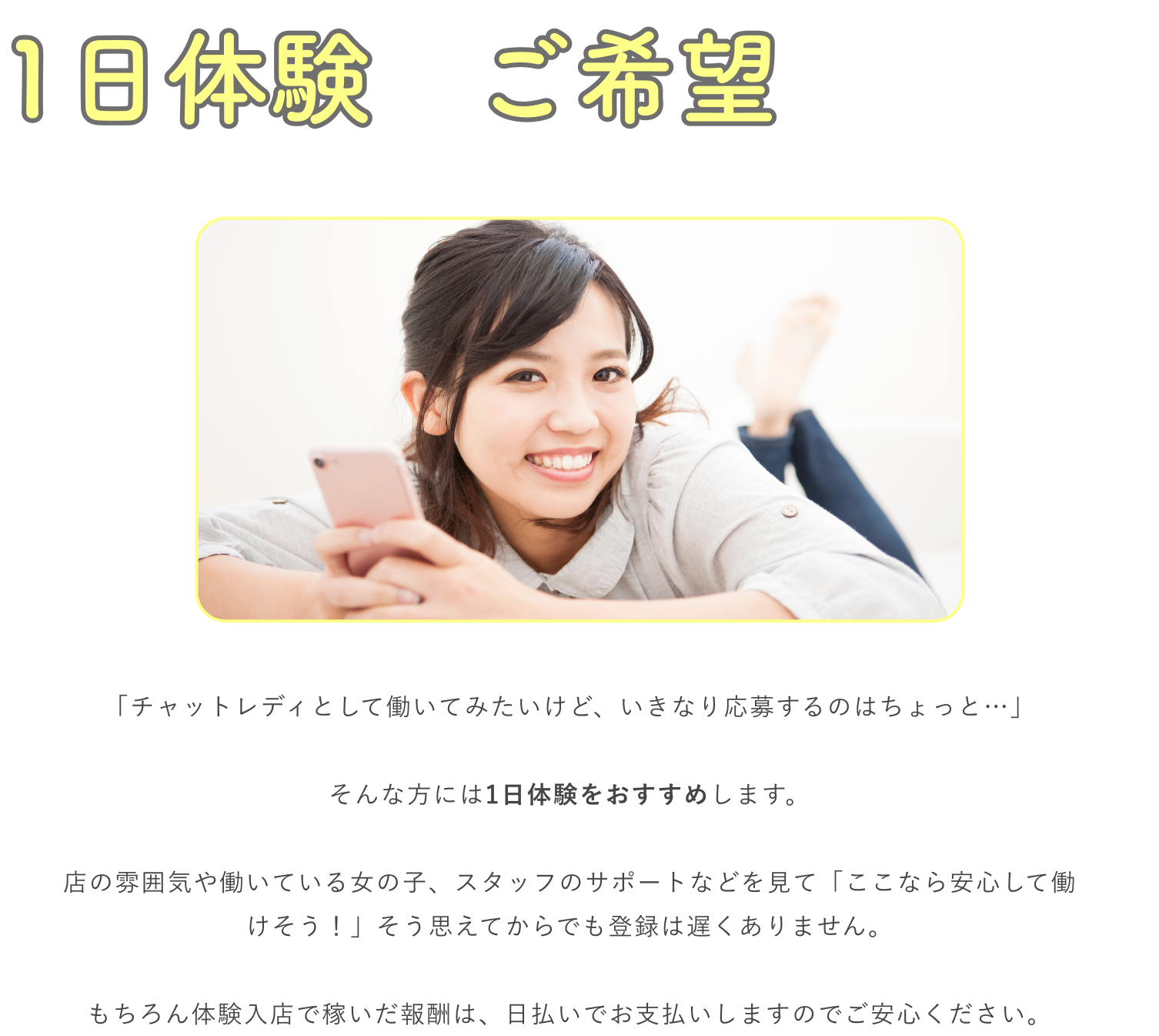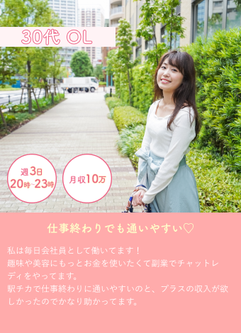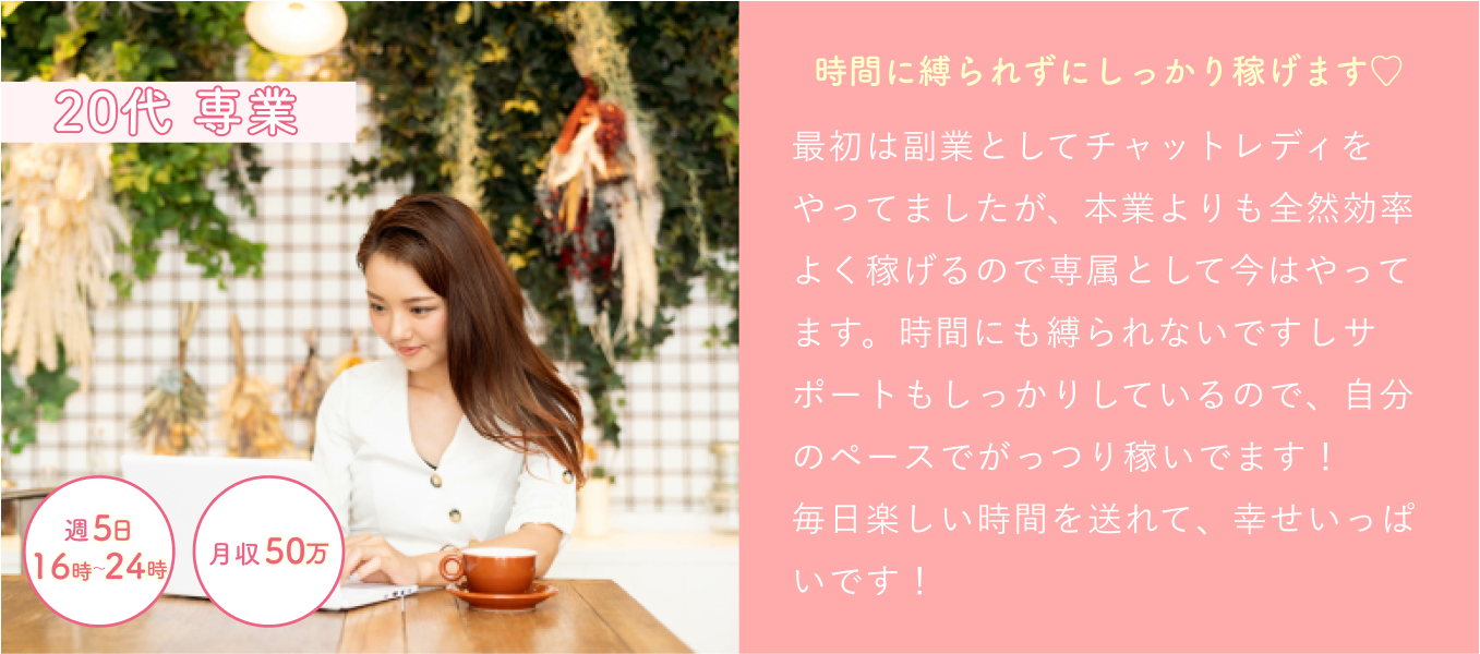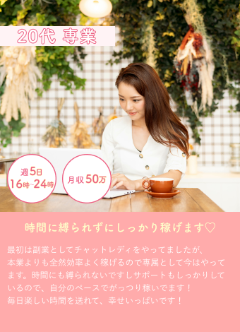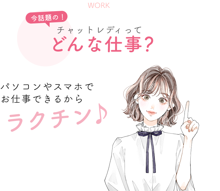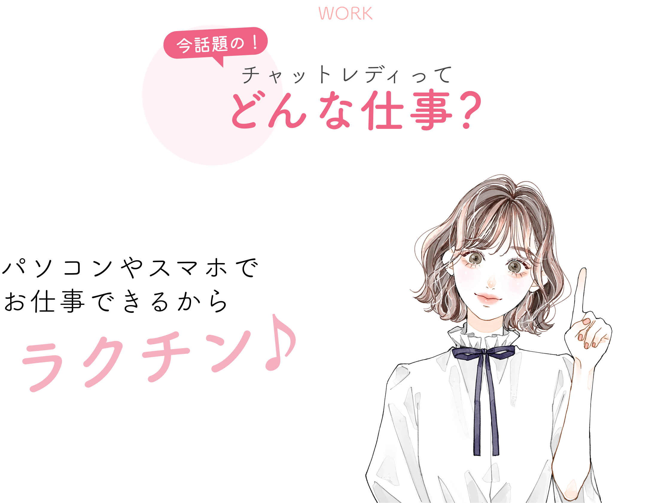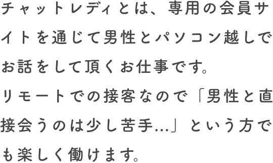 チャットレディとは、専用の会員サイトを通じて男性とパソコン越しでお話をして頂くお仕事です。リモートでの接客なので「男性と直接会うのは少し苦手...」という方でも楽しく働けます。